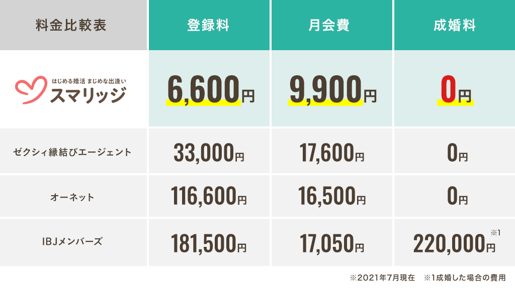 スマリッジの料金は、入会金6,600円と月額9,900円で、成婚報酬も発生しません。